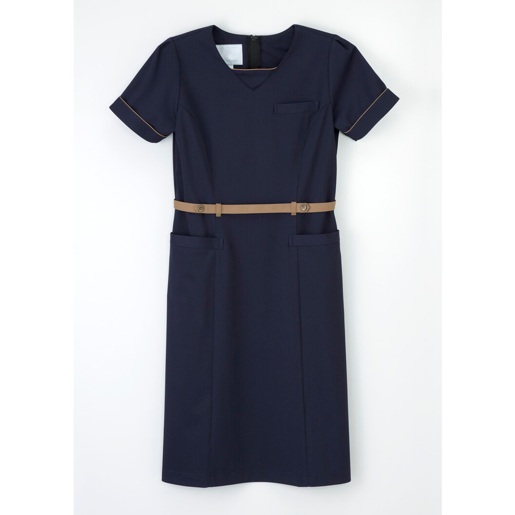 キチンとした印象のシンプルなワンピース。配色のベルトが全体を引き締めるデザインポイントになっています。高機能なニット素材を使用していますので着心地も快適です。