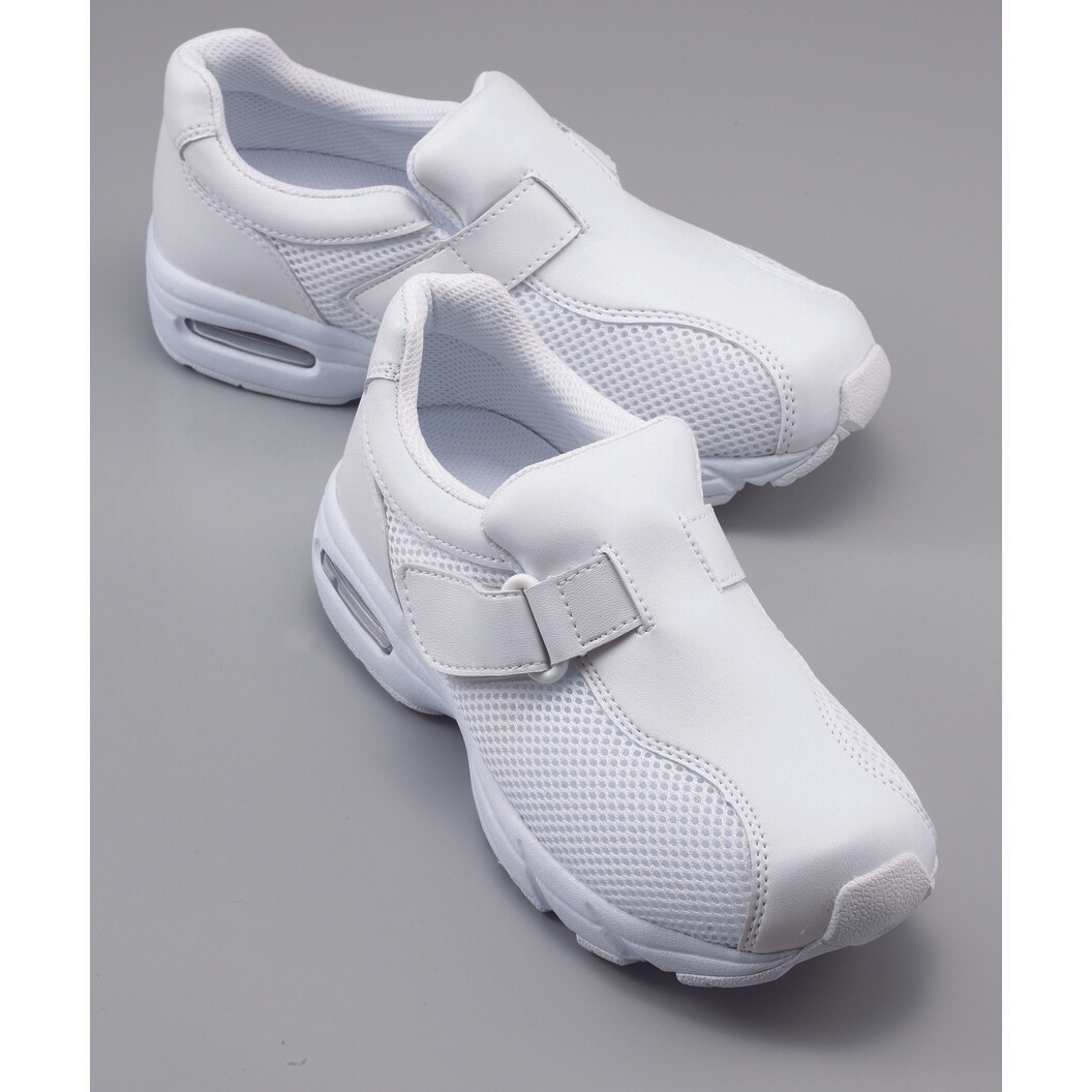 エアークッション内蔵のナースシューズです。歩きやすさを追求したスポーツタイプ。しなやかな足運びをサポートして疲れを軽減してくれるシューズです。忙しく歩き回っても足元を優しくサポートしてくれます。エアークッション内蔵で取り外せるカップインソールは足を守る衝撃吸収材入りのスニーカーです。通気性の高いメッシュ加工でムレにくいです。足の甲がぐにゃぐにゃと曲がるのでどんな体勢も優しくカバーしてくれるナースシューズです。足囲(ワイズ):3E