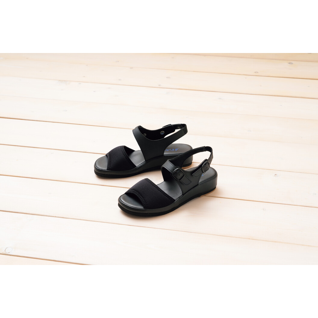 伸縮性が抜群で脱ぎ履きしやすいサンダルが登場。「ストレッチフリー」の超伸縮素材をつま先部分に使用し、足触りも良く、指先まわりをやさしく包み込みます。かかとはゴム付きのベルトでピッタリとフィットするので、窮屈感がなく、仕事中に脱げてしまう心配もなく安心です。甲部分の調整も可能で、甲高の方や甲が薄い方でもフィットします。のびのびストレッチ仕様で快適な履き心地のサンダルです。足囲(ワイズ):フリー