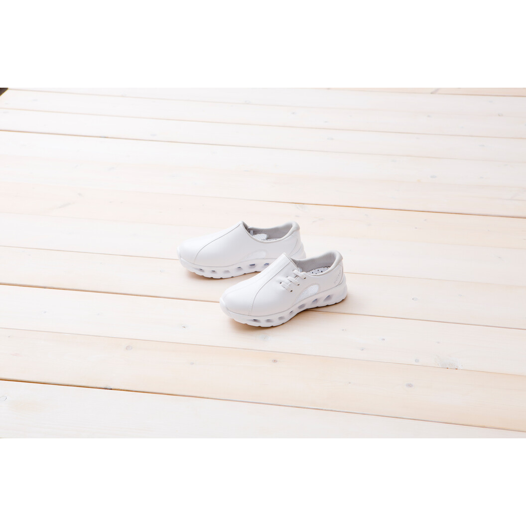 全方位通気のナースシューズです。サイドのゴム紐が今までにない新しいデザイン。足のむくみやすいタ方には、インソールを外して中底のメッシュだけでも履けますので、通気性は更にアップ!疲れにくいクッション性や脱ぎ履きしやすい履き口のデザインなど、毎日忙しく歩き回るナースのために生まれたシューズです。風を感じるほどの通気性を体感し、疲れを知らない、美しく快適な足元へ。足にピッタリフィットしているのにムレにくく、ものすごいクッション性とやわらかさで毎日を快適にサポートしてくれるナースシューズです。足囲(ワイズ):3E