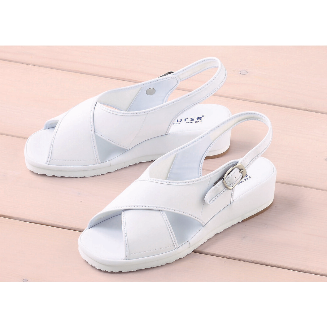 足の甲部分がクロスになっている女性用サンダル靴です。疲れにくいゆったりとした履き心地で、動き回る仕事中に最適なので、ナースシューズとして、オフィスシューズとしてお使いいただいている方が多いです。中敷のすべり止め意匠がなくなりましたので、くぼみにホコリが溜まることもなく、清潔です。デザインもカラーもシンプルなので、幅広い年代の方にご使用いただけます。抗菌、防臭加工付きで、通気性も良く、ムレることもないので快適な女性用シューズサンダルです。足囲(ワイズ):3E