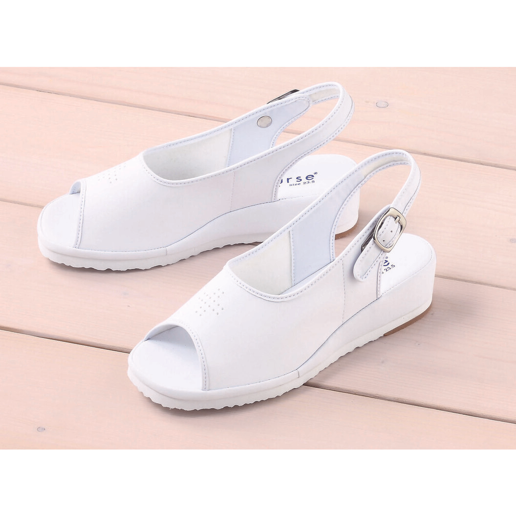 ナースサンダルです。ヒールの高さは4cmと歩くのにちょうどいい高さです。21cmから26cmまで幅広いサイズを取り揃えていています。中敷のすべり止め意匠がなくなりましたのでくぼみにホコリが溜まることもなく、清潔にお使いいただけます。サンダルタイプなので通気性も良く、抗菌防臭の加工付き。軽量なので、長時間の立ち仕事で効果を発揮します。疲れにくいゆったりとした履き心地で、しっかり足を固定してくれるので歩きやすいサンダルです。足囲(ワイズ):3E