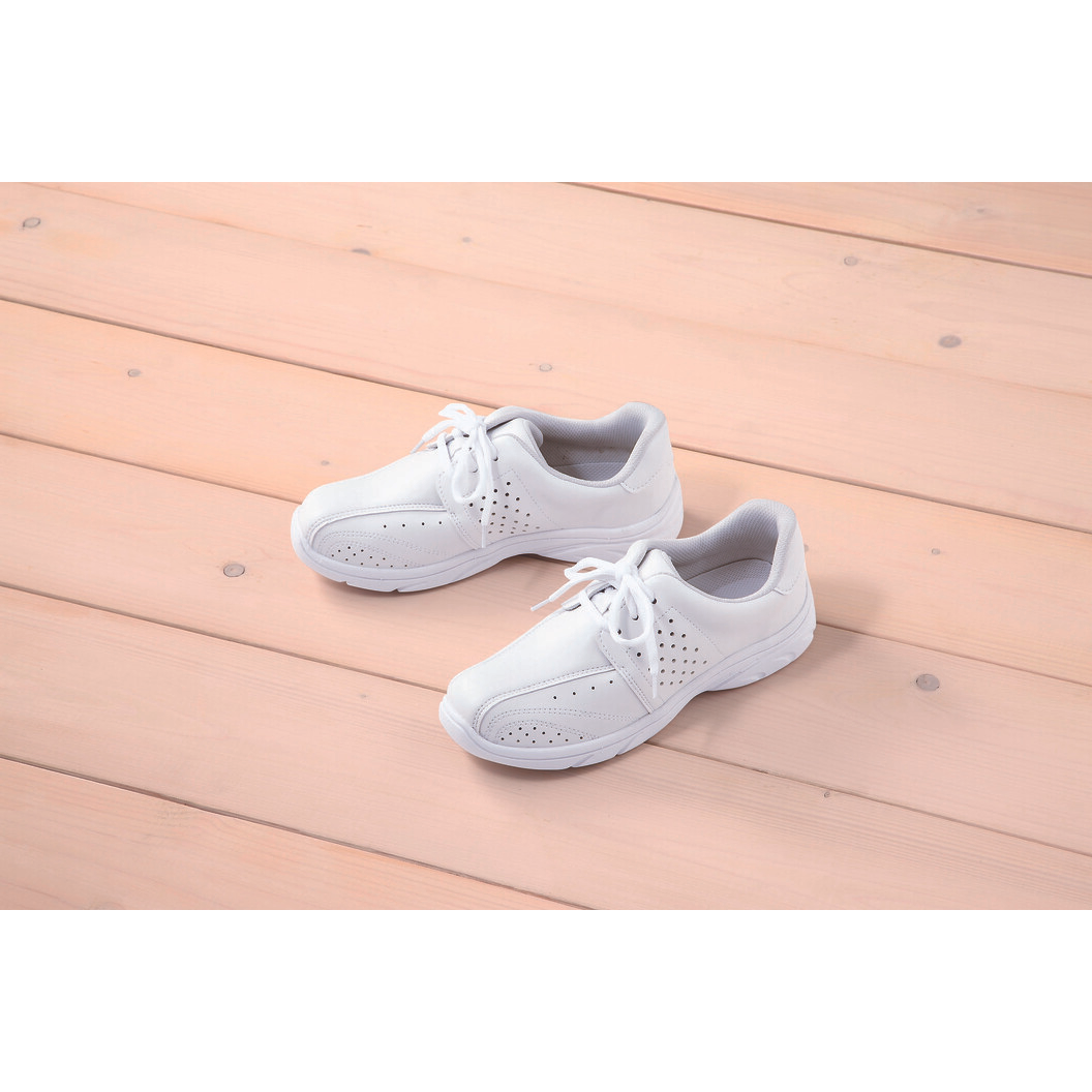 男女兼用で履くことができるスニーカーです。小さいサイズから大きいサイズまで幅広いサイズを取り揃えております。中敷はカップインソールで、抗菌防臭加工があり、臭いを気にせず履き続けることができます。ヒールの高さは3.5cmと歩きやすい高さに設計しました。軽量型シューズなので、長時間の立ち仕事をしても疲れにくいのが特徴です。サイズ調整できる靴ヒモタイプです。クッション性も履き心地も抜群なユニセックスのシューズスニーカーです。足囲(ワイズ):3E