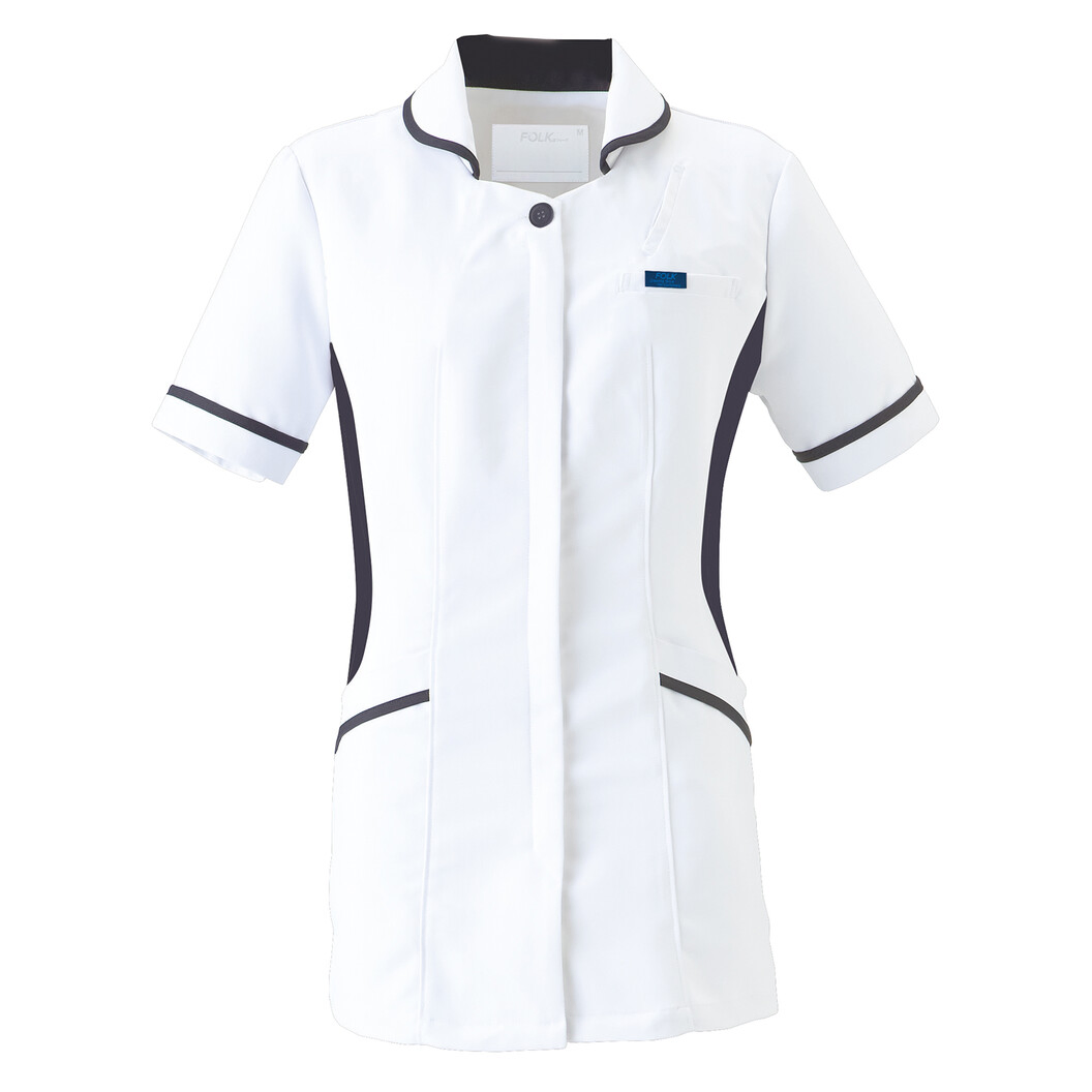 脇に入ったネイビー配色と部分的なテープ使いで全体が引き締まり、キリッとした印象のチュニック白衣です。高い防透性とほどよい伸縮性を兼ね備えた素材です。両脇に入ったネイビーの配色で体をほっそり見せる効果があるチュニックです。おうち洗濯も可能なので、総合病院などでも採用実績が多いです。インナーがひびきにくく、ほどよいストレッチ性のある素材を使ったチュニックで、肌触りの良さも魅力です。SEK制菌加工を施したチュニックなので、繊維上の黄色ぶどう球菌・肺炎桿菌・MRSAなどの増殖を抑制してくれるチュニックです。