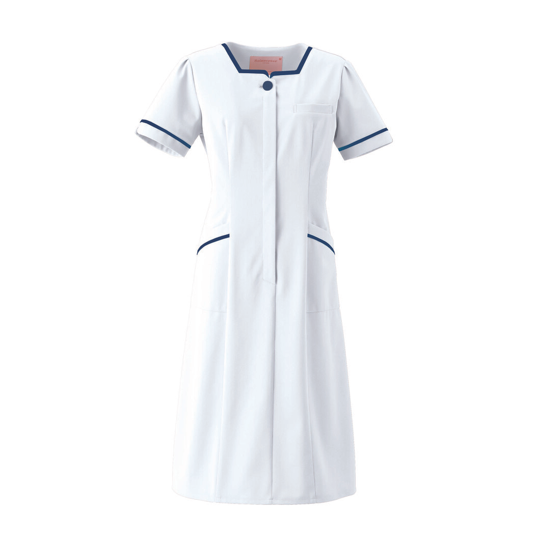 胸元のスクエアカットがクリーンな印象のワンピースは、繊細なディティールにこだわった上質なメディカルウエアです。インナーがひびきにくく白ベースでも透けにくいので安心して着用いただけます。ほどよいストレッチ性のあるポリエステル100%のエーデルワイスという素材を使ったワンピースで、肌触りの良さも魅力です。SEK制菌加工を施したワンピースなので、繊維上の黄色ぶどう球菌・肺炎桿菌・MRSAなどの増殖を抑制します。両脇部分にななめのポケット付きのワンピースです。