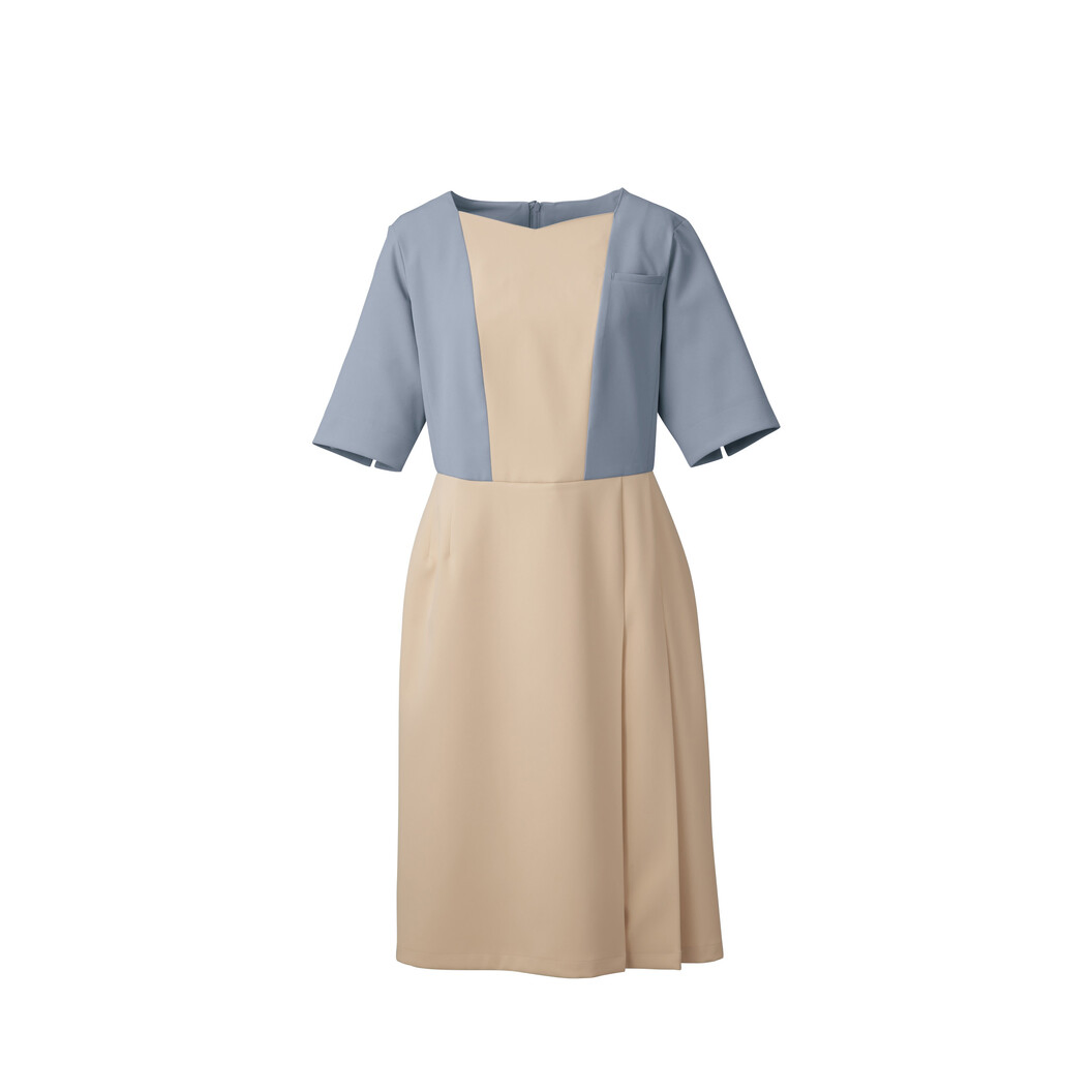 審美歯科・美容整形系クリニックやサロンなどの受付の方をターゲットにした、おもてなしスタイルのワンピースです。片膝をついて応対する「ダウンスタイル」の接客に対応したデザインで、前面にプリーツが入ることで、スカートがずり上がりにくく、立てた方の膝頭を見せないような設計にしています。燕尾服のように後ろに配色が切られているのは、ダウンスタイルでかかとにお尻をのせた際に靴墨などの汚れが目立ちにくいように配慮されているからです。ダークネイビー×ベージュは高級感があり暖色系ならではの柔らかい印象になります。ゼニスブルー×ベージュは清潔感があり爽やかで明るい印象のカラーです。足元はパンプスやナースシューズで合わせたり、首元にスカーフを巻いたりすることで印象もガラリと変わるので、様々なコーディネートをお楽しみいただける、おもてなし向けワンピースです。
