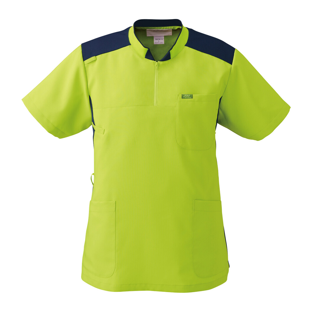 背面全面を通気性・吸汗・速乾性の高いニット素材を使用した男女兼用のジップアップスクラブです。背中部分をニットにすることで通気性がよく、伸縮性により大きな動きにも対応できます。肌にもまとわりつかないさらりとした着心地です。スタンドカラータイプなので衿元も気になりません。リブ襟は汗の吸収も助けます。右肩にPHSのストラップを配置、ストラップを首に回さないので、衛生的かつ安全です。ストレッチ性の高いニット素材を背面に使用することで柔軟な動きに対応するユニセックスのジップアップスクラブです。