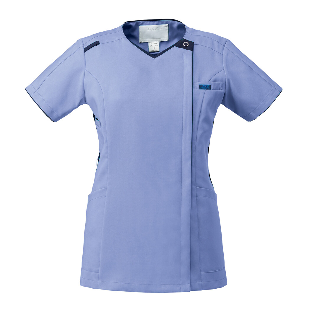 背中部分にニット素材を使った機能的なGENKIシリーズは、羽織るジップタイプだから着脱しやすく、髪型やメイクが崩れにくいのが特徴です。機能的な型ループと重量拡散PHSポケット、腰ポケットは便利な小分けポケットもついています。人体で動きの大きな肩甲骨部分に高い伸縮性のあるニット素材を使用した女性用ジップスクラブです。ニットを使うことで通気性が良く、大きな動きでも柔軟に対応できます。医療用ユニフォームで初のグッドデザイン賞受賞のジップスクラブのシリーズならではの脱着のしやすさは忙しい医療現場には最適です。