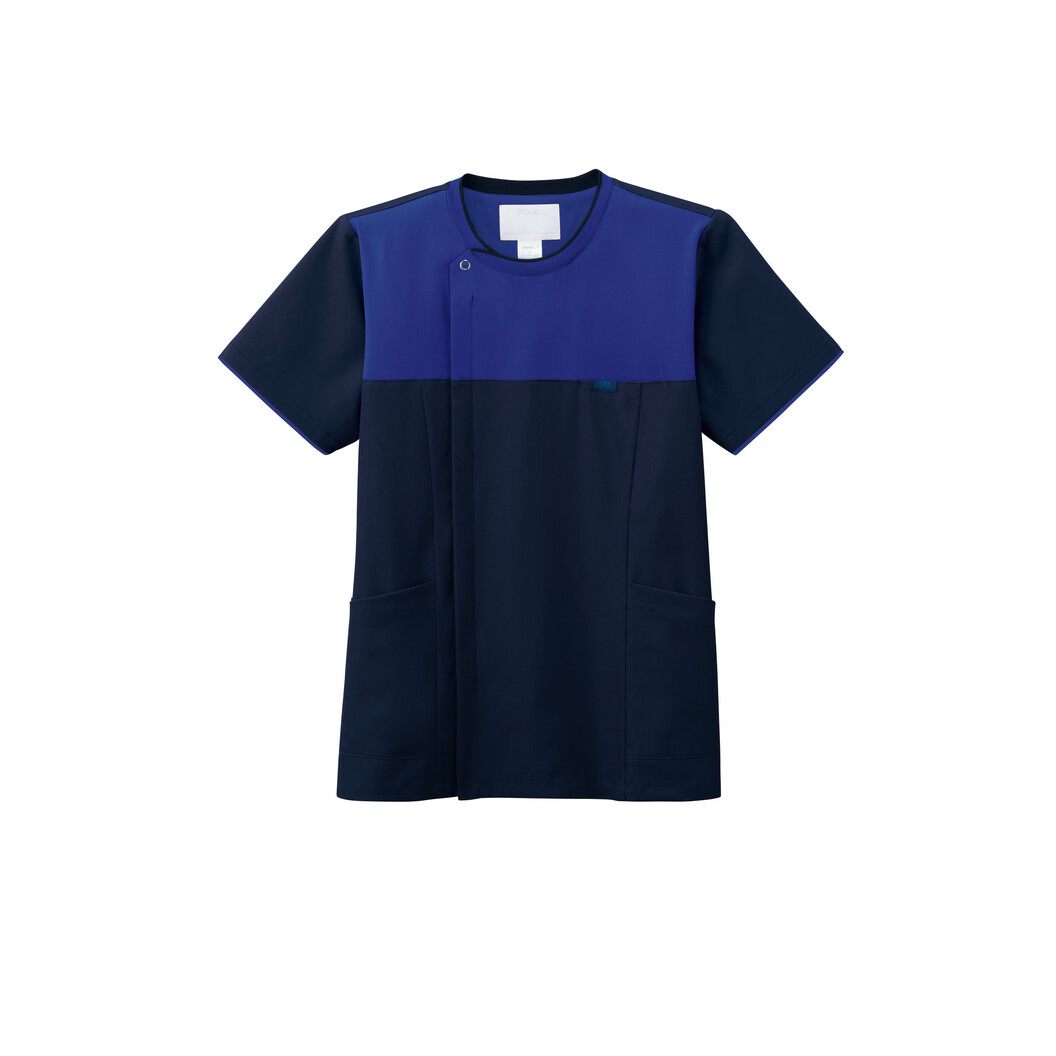 首回りと袖口にリブ素材をあしらった丸首型の男性用ジップスクラブです。メンズらしいクールな落ち着いた色合いながら、丸首のデザインにすることで、柔らかく優しい印象のスクラブとなっています。メンズのスクラブは、ゆとりのあるシルエットと、ジップ部分は男前仕立て(右前)になっています。軽くて丈夫な素材のアリオンストレッチは、伸縮性のよいストレッチ生地で、動きやすさはもちろん、ポリエステル100%で、優れたイージーケア性も嬉しいポイント。後身頃の構造を利用をして、ベンチレーション機能を追加しました。通気性のあるメッシュ生地を裏地に採用することで、空気が抜けるだけでなく、熱がこもらず、空気循環を促してくれるので、動きの多い職種の方でも、一日中快適に着用いただけます。同型のレディースジップスクラブ(7079SC)と合わせて採用することで、施設内に一体感を持たせた、コーディネートが可能です。グッドデザイン賞受賞のジップスクラブは、「羽織って着られる」脱着のしやすさも高く評価されているスクラブです。