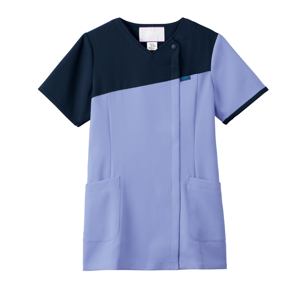 現場の声から生まれた、デザイン・機能性が魅力の女性向けジップスクラブです。前身頃は、斜めの配色切替ラインで女性らしさを表現しつつ、後身頃にかけての縦ラインの配色で、スポーティーさを演出しています。色展開は4色あります。ネイビー配色は、メリハリのついた色合いでアクティブな印象に。白ベースは、優しい色合いで爽やかな印象なので、施設内を明るくしてくれます。大胆な配色が目を惹く、フォークらしいデザインのスクラブとなっています。機能面では、後ろの襟ぐりにループが施され、ストラップのズレや直接首に当たるのを防止してくれます。袖口の下側にはゴムが入っているので、腕を上げた際の袖口の開きを抑えてくれる女性に嬉しい機能もあります。右腰には内ポケットに仕切りがついた収納のしやすいループ付きポケット、左腰には電子カルテが入るサイズの小分けポケットで機能性抜群です。グッドデザイン賞受賞のジップスクラブは、髪型の乱れやメイク崩れのストレスを解消した、「羽織って着られる」脱着のしやすさも高く評価されているスクラブです。