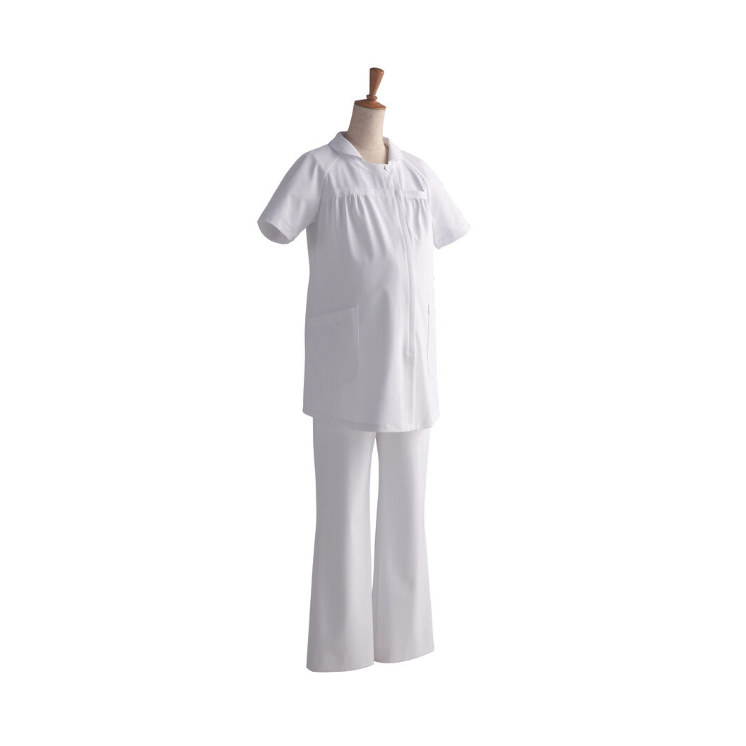 マタニティのためのメディカルウェアです。羽織るタイプはかぶるタイプに比べて着脱がしやすく、お腹に負担をかけません。メイクなどがつきにくいのも特徴です。羽織って着ることができるため、大きくなったお腹のジャマすることなく着脱がカンタンにできます。脇部分はニット素材、お腹が大きくなってもゴムの伸縮性でお腹をしめつけません。実際に妊婦さんからの声や経験談をもとにデザインした妊婦さんにも安心して着用いただけるように設計したマタニティスクラブです。