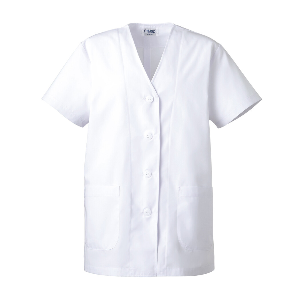 女性用給食着です。清潔感のある襟なしの半袖の白衣です。