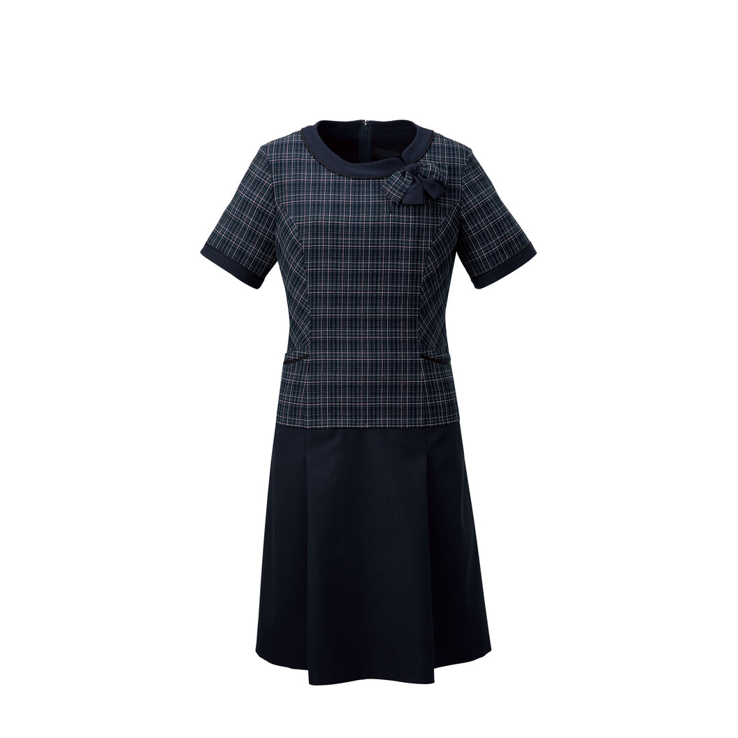 一枚で全身フェミニンを叶えてくれるワンピースです。胸元のリボンで華やぎをプラスします。脇バイヤスとふんわりフレアで、女性らしいシルエットのすっきりとしたツーピース風のおしゃれなデザインです。ラクな着心地で体型カバーもしっかり叶えてくれます。襟と袖口に黒をあしらい、上品に。スカラップパイピングの愛らしいアクセントもポイント!ピンで簡単に付け外しできるリボンは、襟から直接結んだように見えるこだわりの配色のワンピースです。