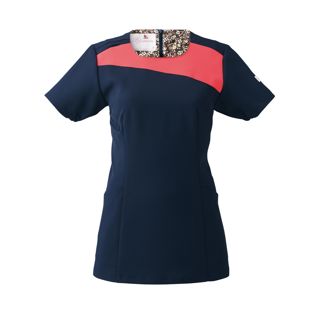 ワコールとフォークの共同開発したワコールHIシリーズのワンピースのように穿いて着るタイプのスクラブです。オシャレなバイカラーで女性の体のラインを美しく見せるシルエットも魅力。やや丸みをおびたスクエアネックと斜めに切り返された配色が印象的なオシャレなスクラブです。女性の体を研究し続けるワコールを長い歳月をかけて作った働く女性を美しく魅せる、機能的なデザインです。繊維の間に極めて細い隙間を作り、綿を越える優れた吸収性と拡散性ドライ間を実現したポリエステル素材を使用しています。背面の裏地は花柄生地でかわいいデザインのスクラブです。