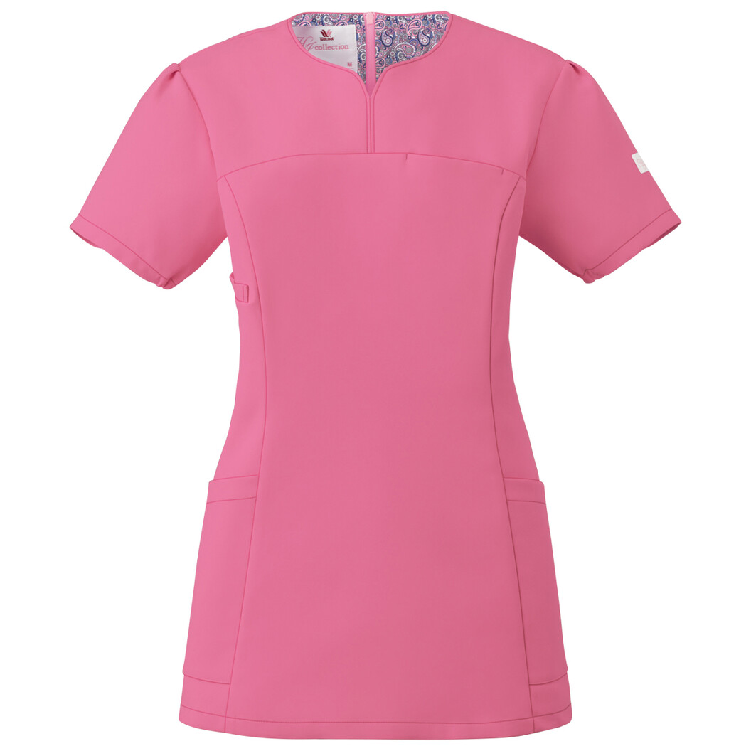 ハート型の襟元が女性らしいワコールHIコレクションシリーズのレディーススクラブです。新色を追加しました。背面の裏地にはペイズリー柄を施し、動いた時や脱いだ時に見えてオシャレなアクセントになっています。柔らかな風合いが特徴の素材であるネオαは、適度な動きやすさと、ポリエステル100%の優れたイージーケア性も魅力です。「履いて着る」ことで、髪型の乱れやメイクがついてしまう心配もありません。ワコールならではのデザインと機能性に優れた、女性に嬉しいレディーススクラブです。