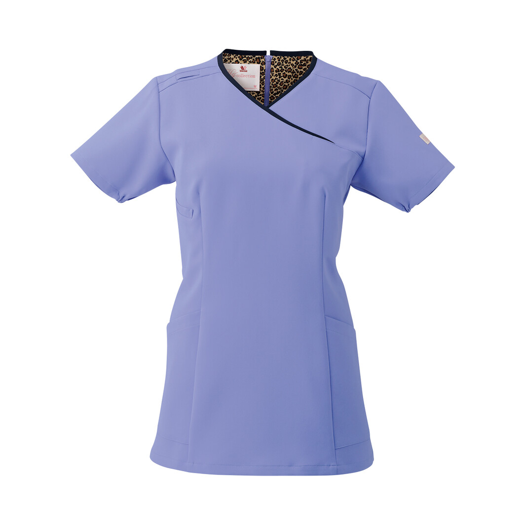 ワコールとフォークの共同開発したワコールHIシリーズのスクラブです。背面の裏地をヒョウ柄にしたクールなデザインが特徴的で、さりげないおしゃれを楽しめます。シンプルでいながら襟もとは配色とカシュクールで女性らしい優しい印象のかわいらしいスクラブです。繊維の間に極めて細い隙間を作り、綿を越える優れた吸収性と拡散性ドライ間を実現したポリエステル素材を使用しました。女性の体を研究し続けるワコールを長い歳月をかけて作った働く女性を美しく魅せ、機能的なデザインを使用した人気のスクラブです。