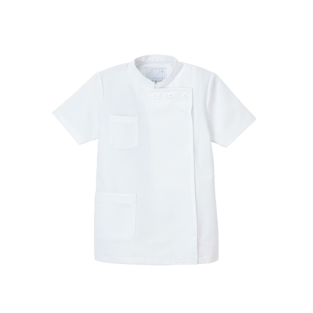 前傾姿勢に楽な前中心明きのスタンドカラーの横掛けスタイルです。すっきりした着心地で着用できます。 ドクターウェアに適したしっかりした編組織です。高い伸縮性を持ち、着心地の良さと動きやすさを提供します。特殊仕上により吸水、防汚効果を付加しています。業務用洗濯にも耐えうる形態安定素材です。