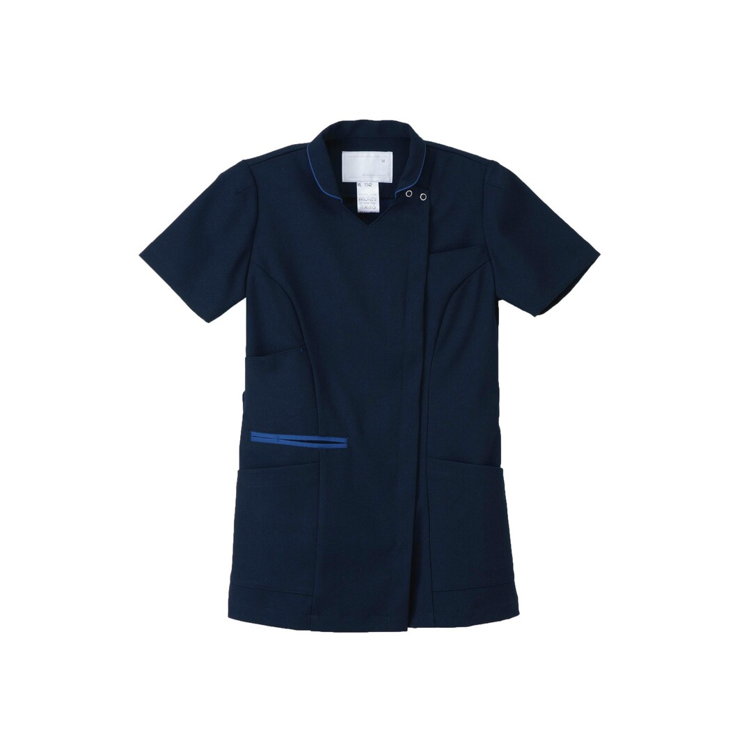 白衣とスクラブのハイブリッドタイプです。それぞれの優れたところを併せ持つニューアイテムです。シャープな衿周りとフロントファスナー開きがポイントです。深い色合いと豊かなストレッチ性が美しさと動きやすさをもたらします。 高級感が感じられる、深みのある色合いが特徴の素材です。ハイストレッチ糸により、極めて高い伸縮性があり、優しい着心地が得られます。異形断面糸により軽く、透けにくく、吸汗性に優れています。適度なハリコシがあり美しいシルエットを表現します。特殊仕上により制電、吸水、防汚効果を付加しています。業務用洗濯にも耐えうる形態安定素材です