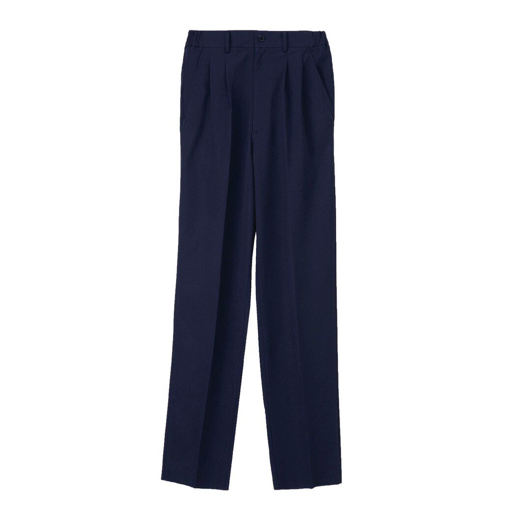 ややゆったりシルエットパンツです。 スーパーアレニエを使用し、かつてない防透性とよりソフトなタッチを実現しています。高い伸縮性を持ち、着心地の良さと動きやすさを提供します。特殊仕上により吸水、防汚効果を付加しています。業務用洗濯にも耐えうる形態安定素材です。