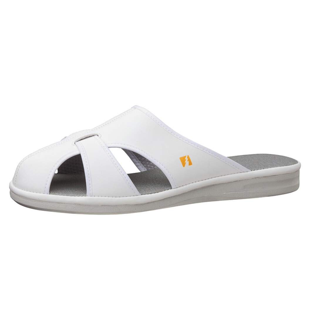 静電シューズにカカトなしタイプが登場 人体に発生した静電気を靴と床を通じて速やか且つ、安全に漏洩させます。 靴底に使用されている発泡ウレタンは軽量で耐摩耗性、クッション性に優れた素材です。 通気メッシュ、または通気構造のソールにより、高い通気性を実現。