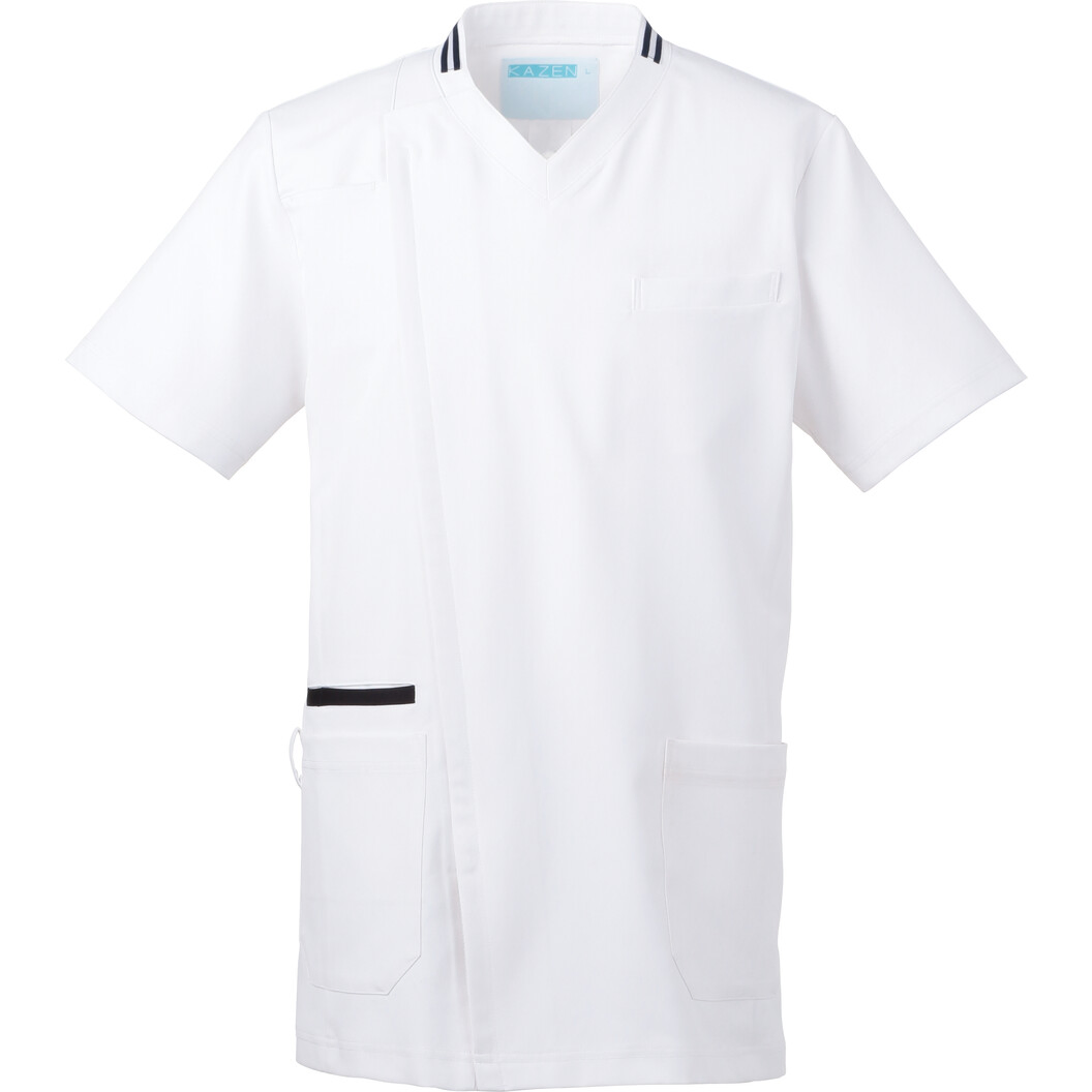 チーム医療をネイビーで表現したNEO NAVY(ネオネイビー)シリーズの一着。 生地は、防透性が高く程よくストレッチ性があり高級感のある織物素材です。 工業洗濯が可能で、静菌加工、スケ防止、吸汗性、静電性、ストレッチ性、防汚加工と、高い機能性も備えています。 衿もとの2本のネイビーラインと、右腰ポケット口の1本のネイビーラインがデザインポイント。 右胸に携帯・PHSポケット付き。両腰ポケットのうち、右腰ポケットは二重仕様。右腰にループ付き。比翼ファスナー仕様。 背面ウエストの切り替えで、スタイルアップ効果もあります。 シンプルでスタイリッシュなスクラブをお探しの方におすすめな一着です。