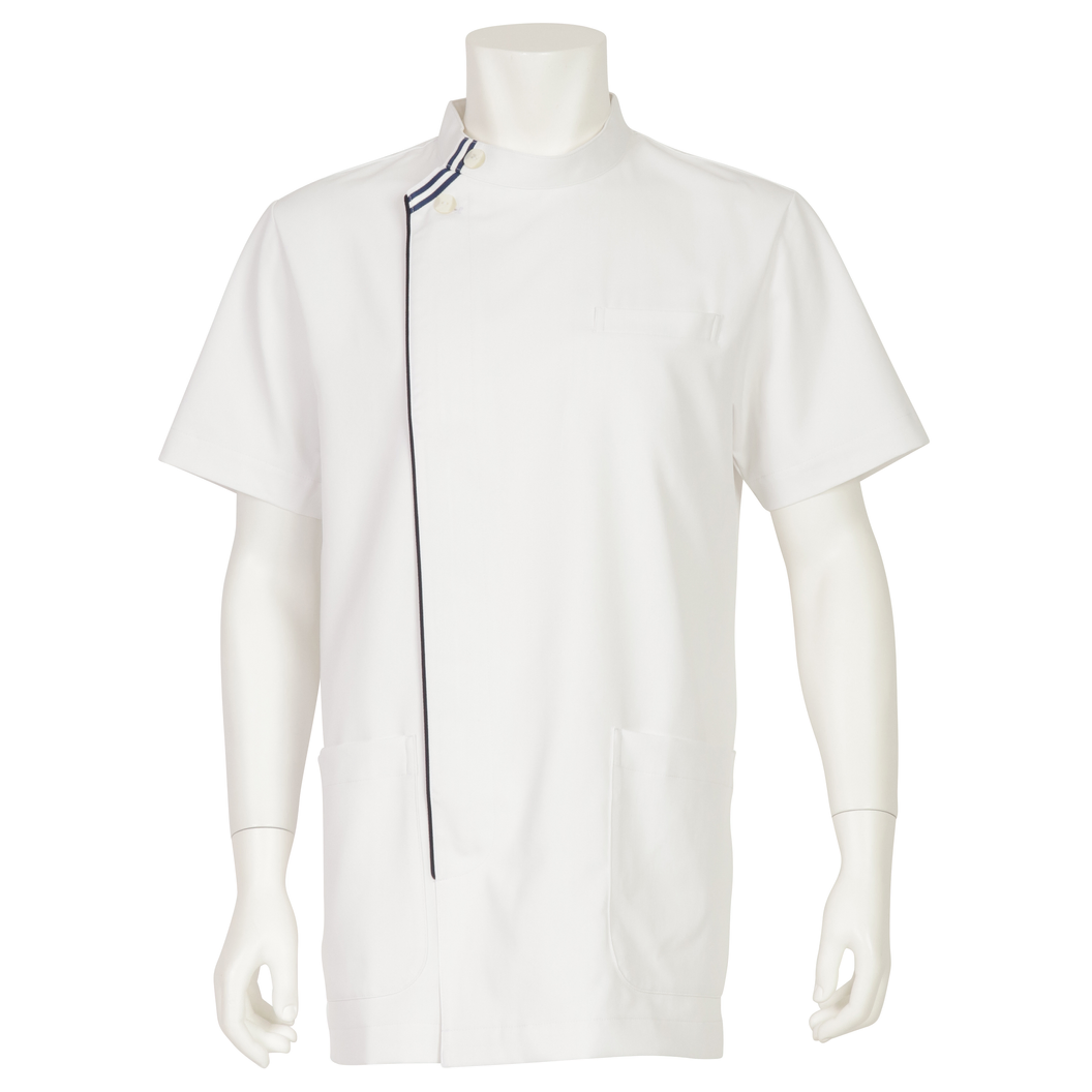 チーム医療をネイビーで表現したNEO NAVY(ネオネイビー)シリーズの一着。 生地は、防透性が高く程よくストレッチ性があり高級感のある織物素材です。 工業洗濯が可能で、静菌加工、スケ防止、吸汗性、静電性、ストレッチ性、防汚加工と、高い機能性も備えています。 ケーシータイプのジャケットです。衿から開閉部分にかけてのネイビーラインがデザインポイント。 左胸に携帯・PHSポケット付き。両腰ポケット付き。比翼ファスナー仕様。 シンプルでスタイリッシュなジャケットをお探しの方におすすめな一着です。