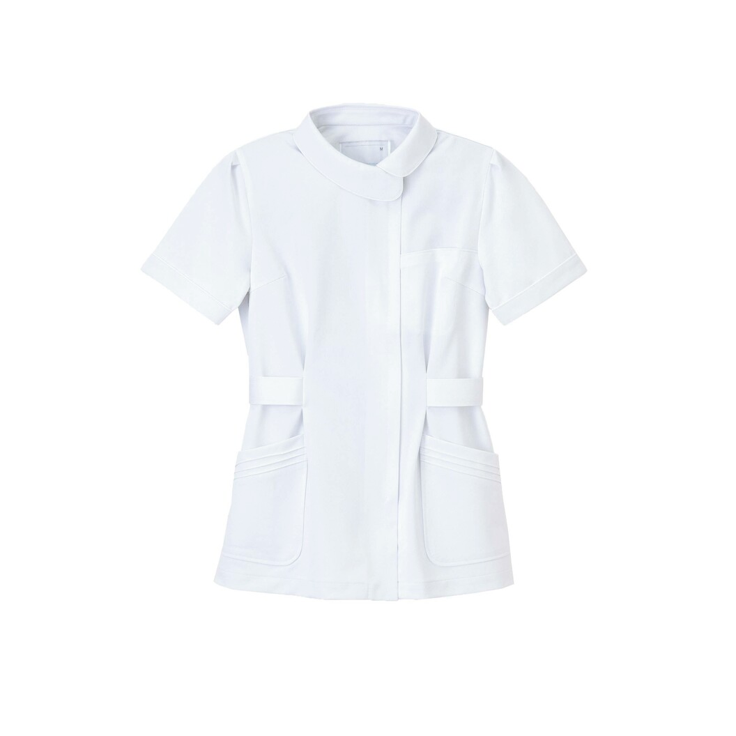 アシンメトリーのロールカラーでゆったりと女性的な雰囲気を作ります。襟と袖口のコードパイピングがポイントです。 特殊異型断面糸使用により、滑らかな風合いとシルキーな光沢、ドレープ性、及び防透性に優れています。再生ポリエステル糸を使用しているためグリーン購入法に対応できます。高い伸縮性を持ち、着心地の良さと動きやすさを提供します。特殊仕上により吸水、防汚効果を付加しています。業務用洗濯にも耐えうる形態安定素材です。