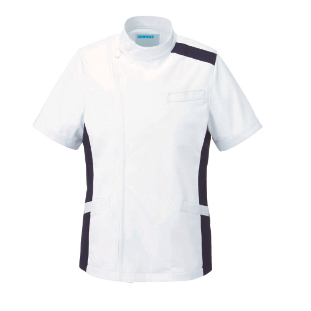 アシンメトリーな配色デザインです。 使用している生地は、裏綿で肌ざわりがやさしく、やわらかいニット素材です。 工業洗濯が可能で、静菌加工、スケ防止、吸汗性、静電性、ストレッチ性、防汚加工と、高い機能性も備えています。 ケーシータイプのジャケットです。左肩、両脇の配色がデザインポイント。 左胸に携帯・PHSポケット付き。左胸ポケットに内ポケット付き。 両腰ポケットのうち、左腰ポケットに内ポケット付き。比翼ファスナー仕様。 スポーティなジャケットをお探しの方におすすめな一着です。