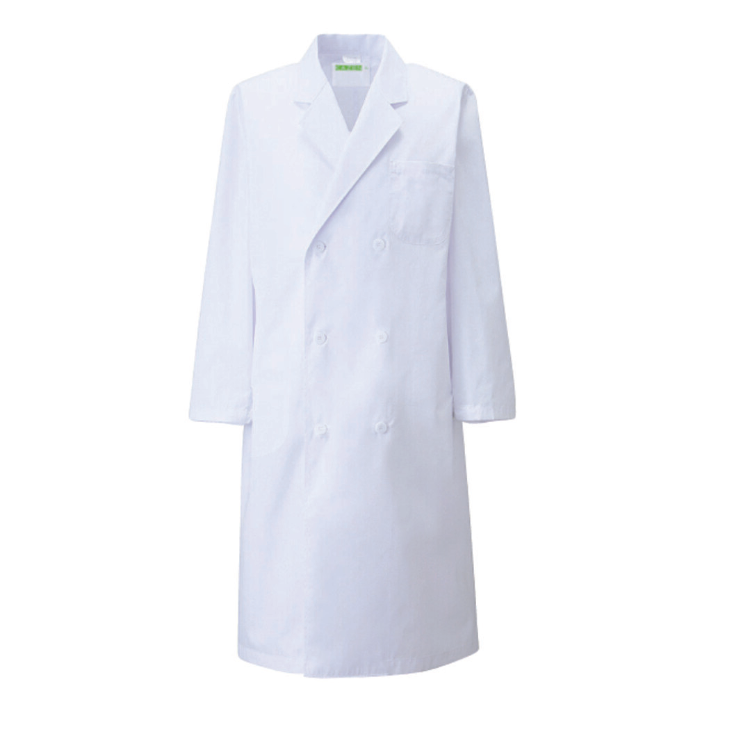 ダブルのメンズ診察衣です。スタンダードなデザイン。 なめらかな表面が美しい織物素材、綿100%のキャラコを採用。 左胸、両腰ポケット付き。胸ポケット内にペン差し付き。 袖口ひも入りで、しぼれる仕様。後ろ身頃センターベント入りで足さばきも軽快に。実用性も考慮しています。