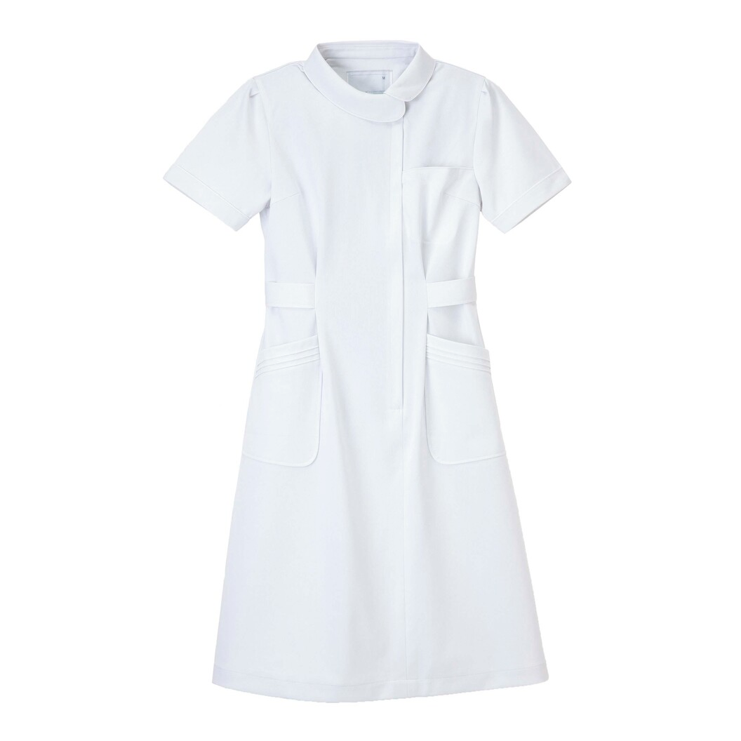 いつもきちんとした身だしなみを求められるナースたちに新鮮なディテール。アシンメトリーのロールカラーでゆったりと女性的な雰囲気を作ります。襟と袖口のコードパイピングがポイントです。 特殊異型断面糸使用により、滑らかな風合いとシルキーな光沢、ドレープ性、及び防透性に優れています。再生ポリエステル糸を使用しているためグリーン購入法に対応できます。高い伸縮性を持ち、着心地の良さと動きやすさを提供します。特殊仕上により吸水、防汚効果を付加しています。業務用洗濯にも耐えうる形態安定素材です。