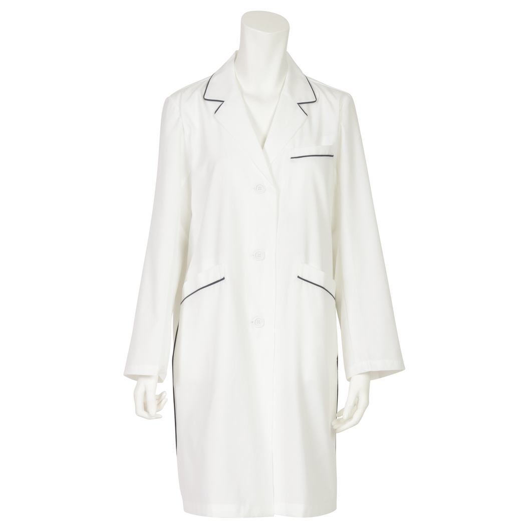 シングルのレディスのハーフ丈診察衣です。衿先とポケット、脇のネイビーパイピングがデザインポイント。 ストレッチ性があり工業洗濯可の織物素材、ポリエステル85%・綿15%のストレッチシーティーワイを採用。 制菌加工、吸汗性も備えています。 左胸、両腰ポケット付き。胸ポケット内にペン差し付き。 右腰ポケットに内ポケット付き。実用性も考慮しています。