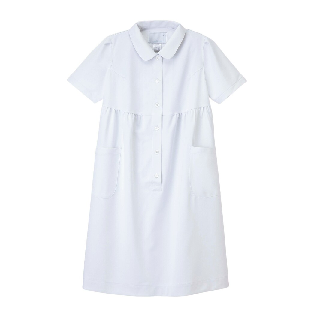 ゆったりした肩回り、脇に寄せたポケットなど、細部に工夫を凝らしています。後ろウエストにはベルトを付け、おなか回りの調節ができます。 特殊異型断面糸使用により、滑らかな風合いとシルキーな光沢、ドレープ性、及び防透性に優れています。再生ポリエステル糸を使用しているためグリーン購入法に対応できます。高い伸縮性を持ち、着心地の良さと動きやすさを提供します。特殊仕上により吸水、防汚効果を付加しています。業務用洗濯にも耐えうる形態安定素材です。