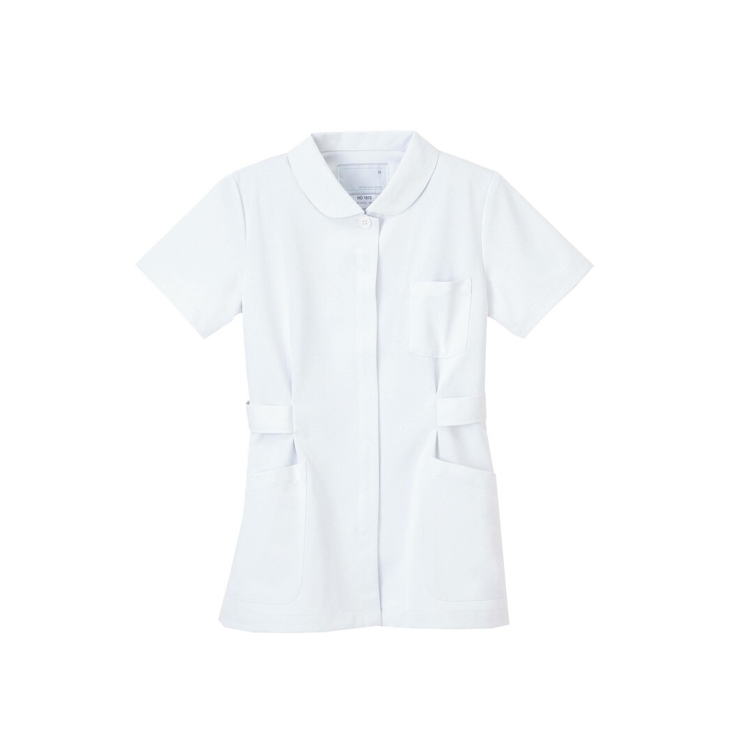 シンプルな中にも、丸襟が女性らしさを感じさせています。ウエストのタックとベルトで誰にでも着やすいシルエットを出しています。 光の透過性を抑えた高ランダム扁平断面糸(アレニエ)を使用することにより、高い防透性を実現しました。適度な伸縮性が動きやすさをもたらせています。特殊仕上により吸水、防汚効果を付加しています。業務用洗濯にも耐えうる形態安定素材です。