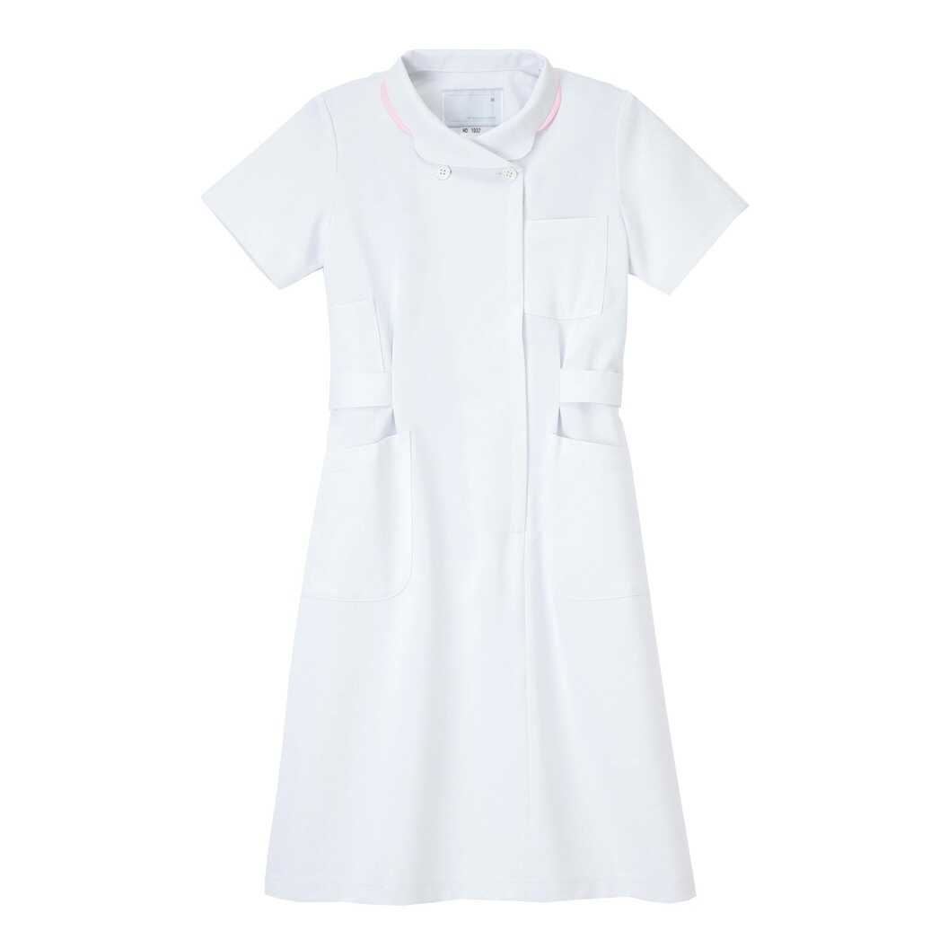 花びらを思わせるソフトな衿にポイントを加えました。優しさに楽しさをプラスしています。右脇にPHS用のポケットが付いています。 光の透過性を抑えた高ランダム扁平断面糸(アレニエ)を使用することにより、高い防透性を実現しました。適度な伸縮性が動きやすさをもたらせています。特殊仕上により吸水、防汚効果を付加しています。業務用洗濯にも耐えうる形態安定素材です。
