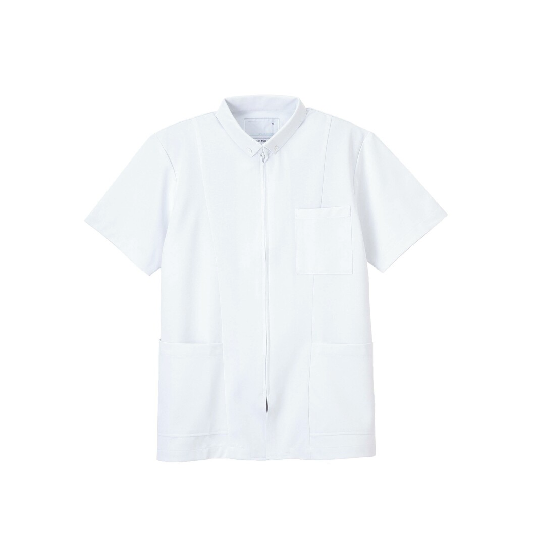 襟はボタンダウンスタイルにして、変化を出しています。着脱がスムーズな前中心ファスナー開きです。 光の透過性を抑えた高ランダム扁平断面糸(アレニエ)を使用することにより、高い防透性を実現しました。適度な伸縮性が動きやすさをもたらせています。特殊仕上により吸水、防汚効果を付加しています。業務用洗濯にも耐えうる形態安定素材です。