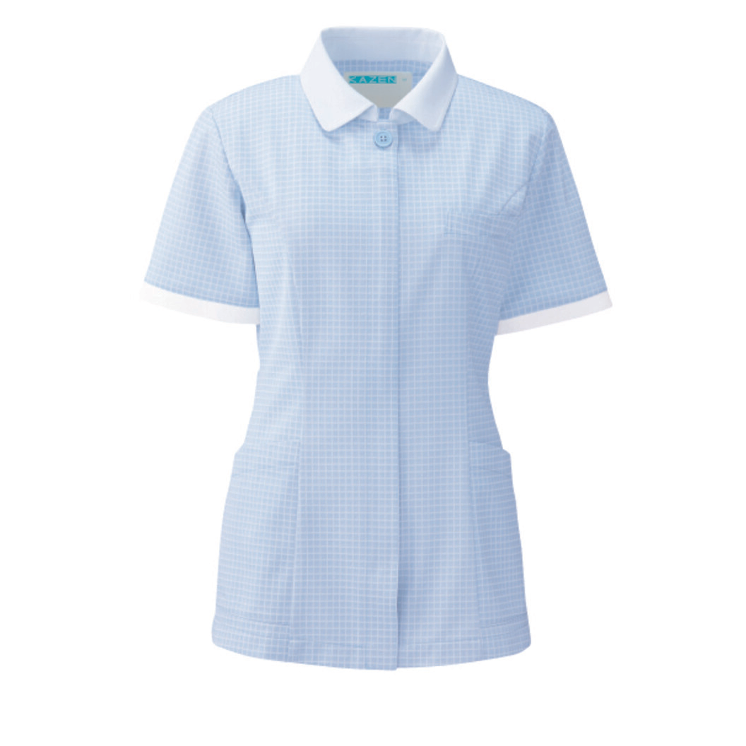 シャドー調の格子柄がさわやかなクレリックカラーのジャケットです。 生地は、上品な光沢感のあるニット素材です。 工業洗濯が可能で、静菌加工、スケ防止、吸汗性、静電性、ストレッチ性と、高い機能性も備えています。 左胸に携帯・PHSポケット付き。両腰ポケット付き。両腰ポケットのうち、右腰ポケットに内ポケット付き。 比翼ファスナー仕様。背面のウエストベルトでスタイルアップ効果があります。 さわやかなジャケットをお探しの方におすすめな一着です。
