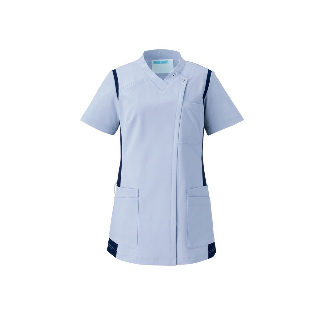 半袖のレディススクラブジャケットです。機能性を追求した【Smart Scrubシリーズ】。 軽量でストレッチ性があり工業洗濯可の織物素材、ポリエステル100%のストレッチセンサーを使用。制菌加工、スケ防止、吸汗性、制電性も兼ね備えています。 脇の濃色の配色でスマートに見えるスタイルアップ効果あり。両胸ポケット、両腰ポケット付き。両腰ポケット二重仕様。右腰ポケットにループ付き。比翼ファスナー仕様。実用性も考慮しています。