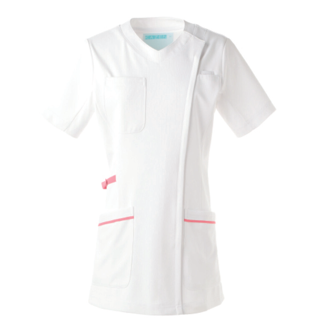 半袖のレディススクラブジャケットです。 右胸に携帯・スマートフォン対応ポケット付き、左胸に名札ループ付き、右腰上部にループ付箱ポケット付き、右腰ポケットにダブルループ付き、左腰ポケットに内ポケット付き、比翼ファスナー仕様です。