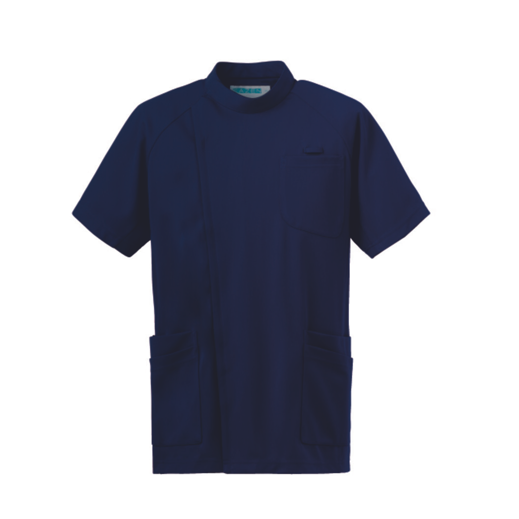 半袖のメンズジャケットです。 左胸に携帯・スマートフォン対応ポケット・名札ループ付き、腰ポケット二重仕様、右腰ポケットにループ付き、比翼ファスナー仕様、動体裁断®仕様です。