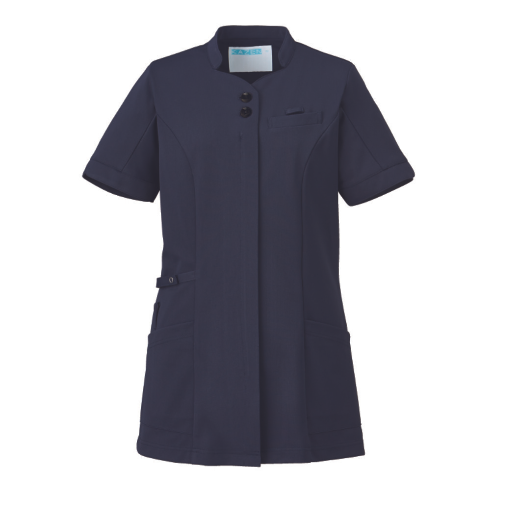 半袖のレディスジャケットです。 左胸に携帯・スマートフォン対応ポケット付き、左胸に名札ループ付き、右腰上部にループ付箱ポケット付き、右腰ポケットにダブルループ付き、両腰ポケットに内ポケット付き、比翼ファスナー仕様、動体裁断®仕様です。