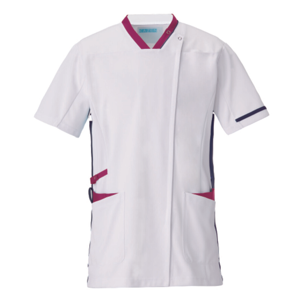 身体の動きにシンクロし、動いている時が最も美しい”4 DIMENSION MOTION CUTTING SYSTEM ”with LIEN 4D FITT動体裁断シリーズ。 動体裁断とは、スポーツウェアで多大な実績を誇る中澤研究室指導のもと、人体・皮膚の解剖分析と衣服理論の相乗化によって衣服の動きやすさを極限まで追及した、立体裁断をも超える画期的な「動体裁断」衣料設計システムのことです。 介助はストレスフリーで美しく、ハードな動きは疲れにくく、腕の上げ下げがスムーズで、長時間の作業も快適に着用いただけます。 使用している生地は、軽量でストレッチ性が高くシルエットのきれいさを引き立てるジャージーニット素材。 工業洗濯が可能で、静菌加工、スケ防止、吸汗性、静電性、ストレッチ性と、高い機能性も備えています。 衿もと、ポケット口、両脇のビビッドな配色がデザインポイント。両脇の配色によりスタイルアップ効果もあります。 左胸に携帯・スマートフォン対応ポケット付き。左胸に名札ループ付き。 両腰ポケットは聴診器が入る大きさ。両腰ポケットに内ポケット付き。右腰にループ付き、箱ポケット付き。比翼ファスナー仕様。 衿は首にストラップをかけた際、衿腰が高めなため、ストラップが直接首に当たりにくい仕様です。 高機能なスクラブジャケットをお探しの方におすすめな一着です。
