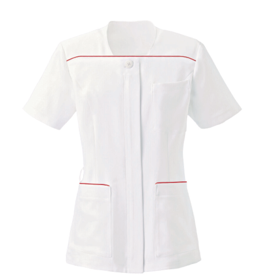 両腰ポケットに内ポケット付き、右腰にループ付き、比翼ファスナー仕様の半袖レディスジャケットです。