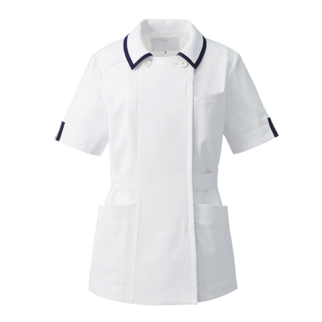 半袖のレディスジャケットです。 右胸に携帯・PHS用ポケット付き、左胸ポケットに内ポケット付き、腰ポケットに内ポケット付き、比翼ファスナー仕様です。