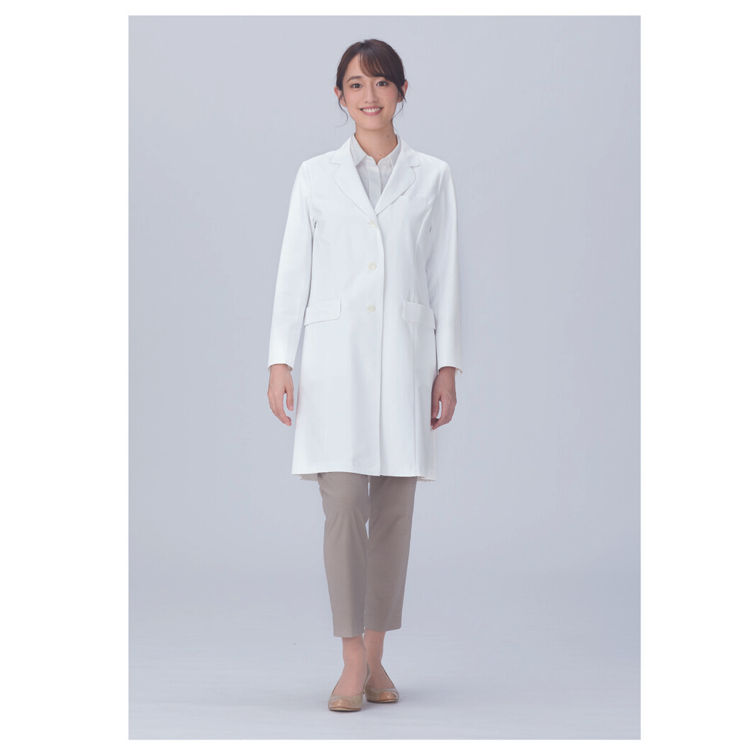シングルのレディスの診察衣です。 丸みのある衿でやさしい印象。 後ろ見頃ウエスト高めの位置にベルトがあり、スタイルアップ効果があります。 袖口にスリットあり、折り返しでき、袖の長さの調整ができます。 軽量でストレッチ性があり工業洗濯可の織物素材、ポリエステル100%のストレッチセンサーを採用。 制菌加工、スケ防止、吸汗性、制電性も兼ね備えています。 左胸、両腰ポケット付き。腰ポケットに内ポケット付き。実用性も考慮しています。