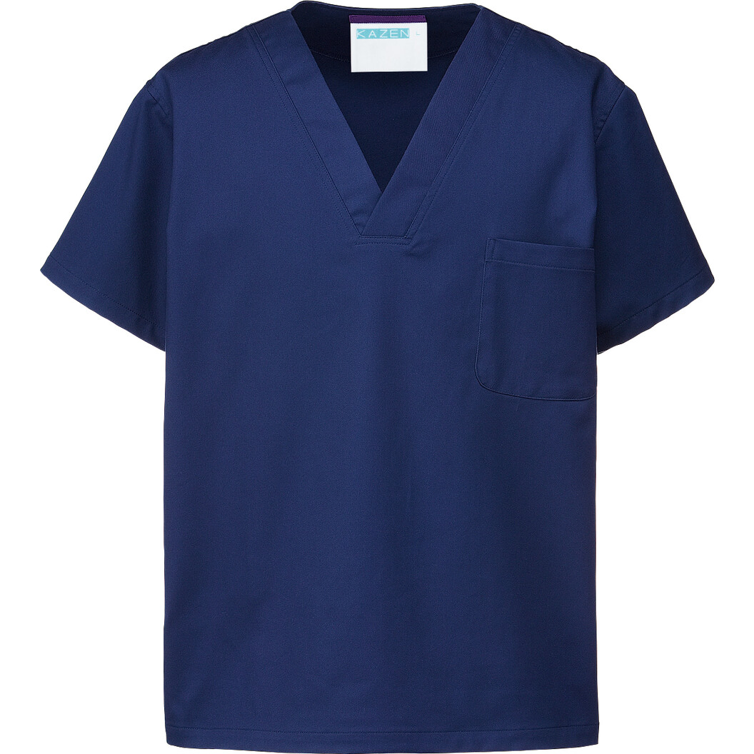 男女兼用のスクラブです。 左胸ポケット付き、商品内側(ネーム)部分にカラーテープ付きです。