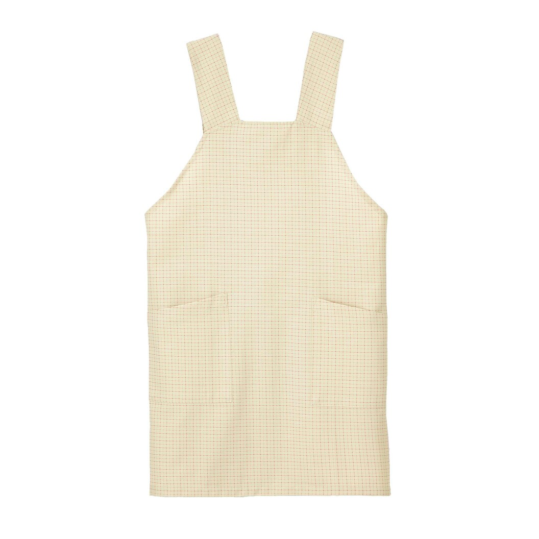 バーガンディの格子柄がナチュラルなベージュに映えています。作業が軽快に出来るミニ丈にしました。 アクセントカラーを配したチェック柄が特徴の素材です。特殊仕上により吸水、防汚効果を付加しています。業務用洗濯にも耐えうる形態安定素材です