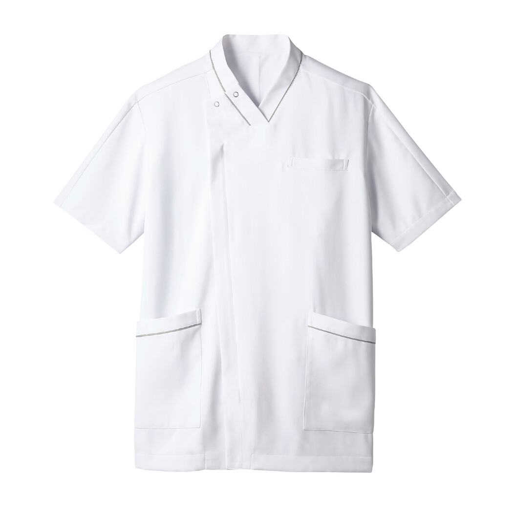 住商モンブランのスクラブです。 制菌・透け防止・吸汗・制電・防汚加工を付与した、シャープなVネックのスタンドカラーのアイテムです。