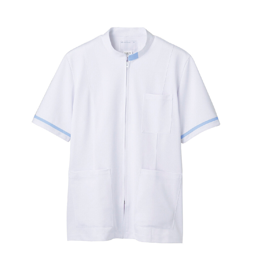 住商モンブランのメディカルジャケットです。 制菌・透け防止・吸汗速乾・制電・防汚加工を付与した、襟元と袖のカラーポイントが印象的なジップアップウェアです。 グリーン購入法対象商品。