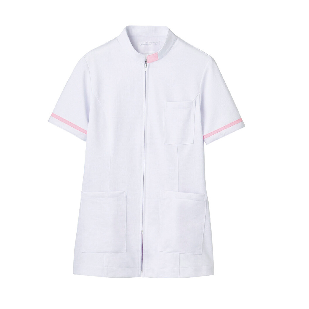 住商モンブランのスタンドカラータイプのメディカルジャケットです。 制菌・透け防止・吸汗速乾・制電・防汚加工を付与した、襟元と袖のカラーポイントが印象的なジップアップウェアです。 グリーン購入法対象商品。