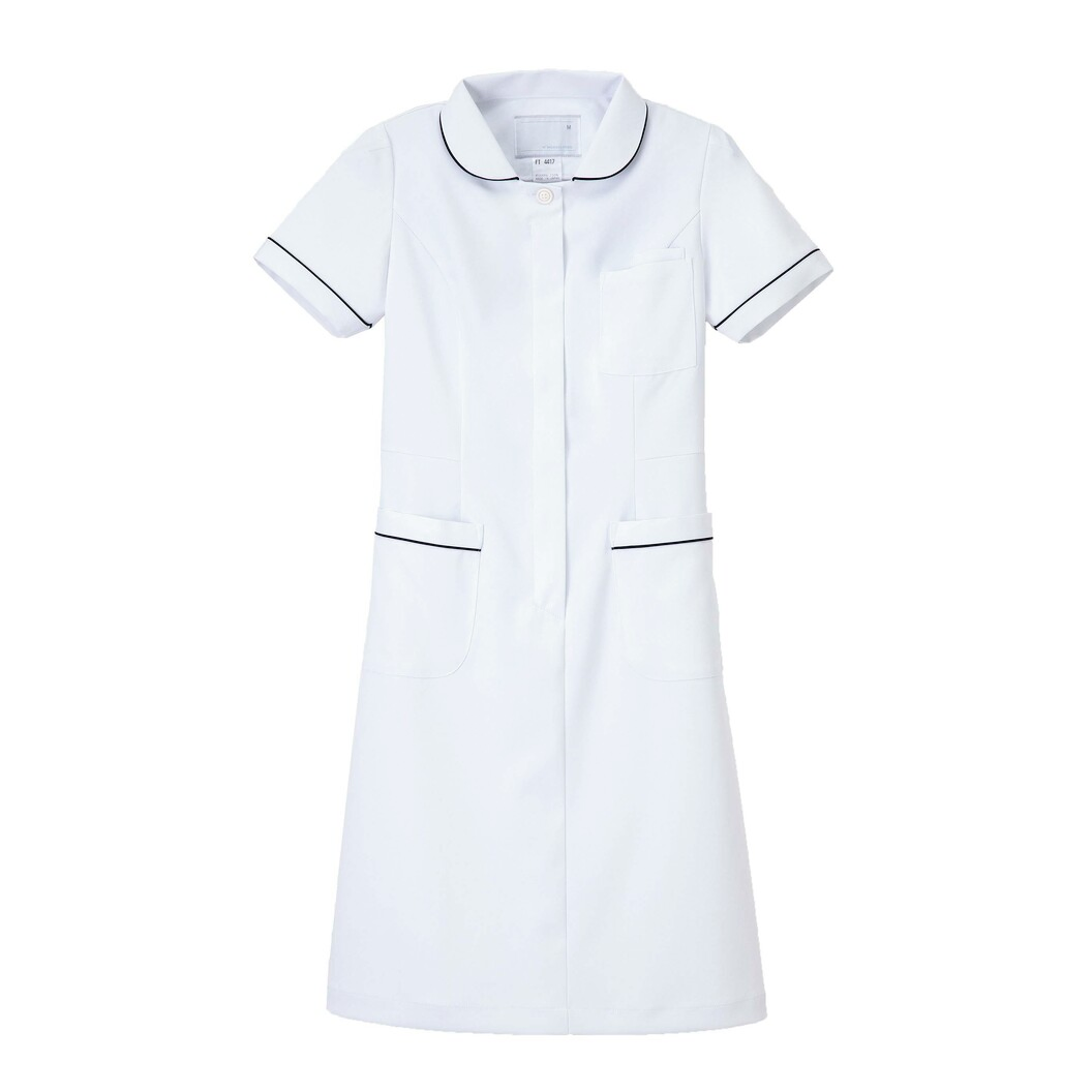 衿元が開いているデザインはフェイスラインをすっきり見せてくれます。ナースの動きに対応するよう開発した伸縮性バツグンの素材なので、すっきりシルエットが可能になりスマートに見せてくれます。 特殊断面フルダル糸を使用し、高い防透け性能と吸汗速乾性を持っています。高い伸縮性による着心地の良さと動きやすさを持った素材です。特殊仕上により吸水、防汚効果を付加しています。業務用洗濯にも耐えうる形態安定素材です。